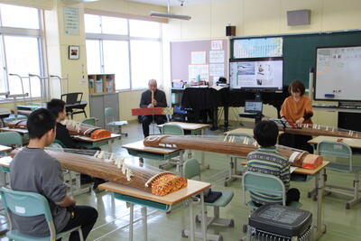 音楽鑑賞授業 投稿: 樹海学校 (10:40) 1月30日、6年生と7年生の音楽で鑑賞授業を行いました。尺八奏者の阿部様、箏奏者の濱本様を講師にお招きし、6年生では「春の海」、7年生では「六段の調」の演奏を鑑賞しました。講師の演奏から曲の雰囲気、イメージを感じ取ることができました。また、子どもたち自身でも箏の演奏を行いました。尺八と箏の音色に触れ、実際に楽器に触れる貴重な機会となりました。 Tweet -